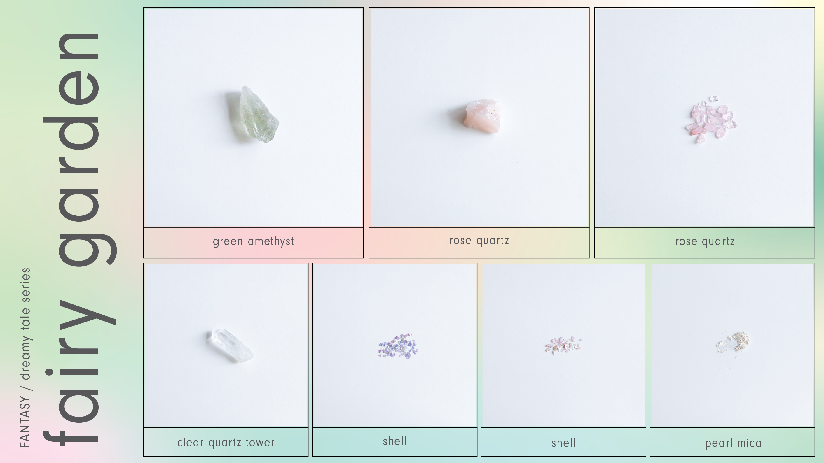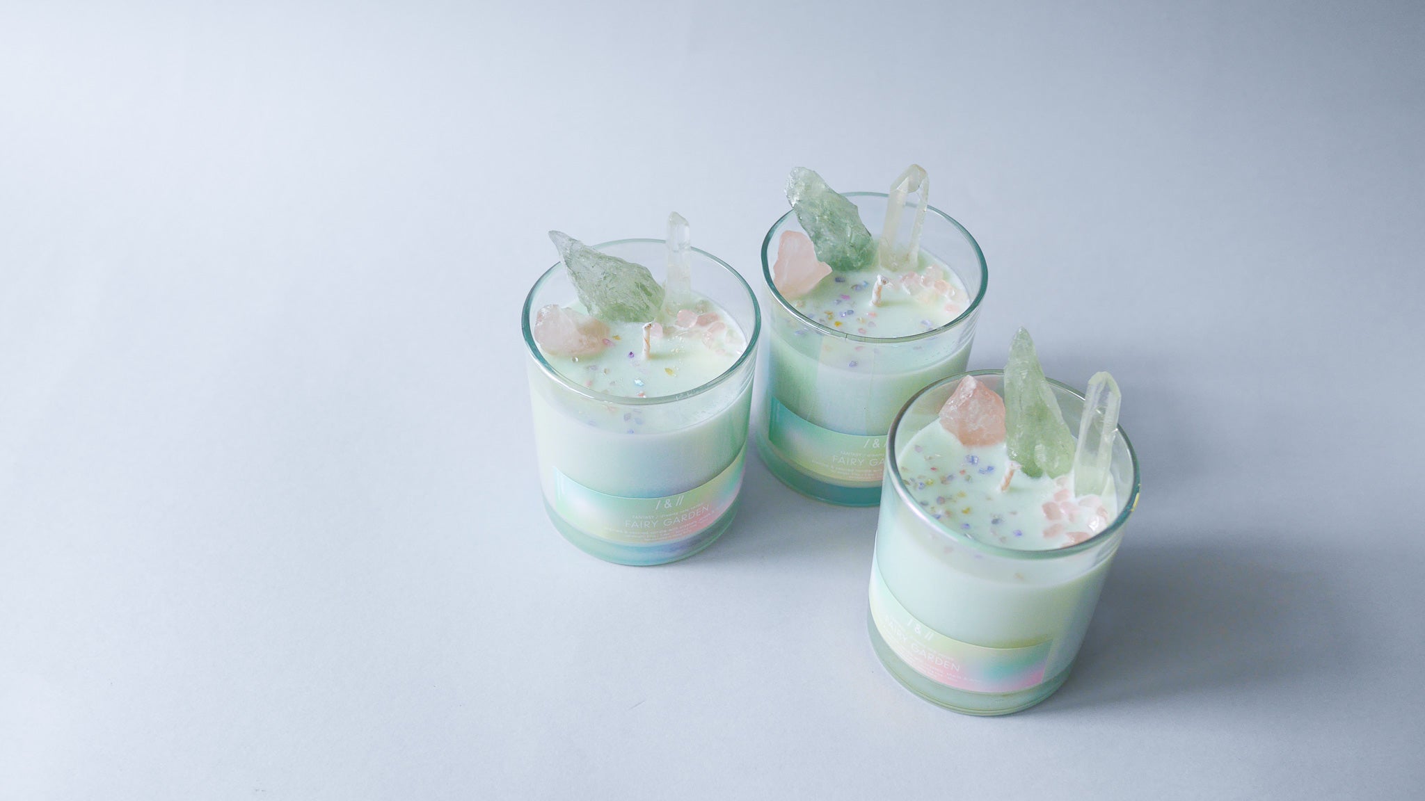 我們為仙女的花園氣味定下綠和粉紅色主題,並挑選與之呼應的寶石: green amethyst 綠水晶 & rose quartz 粉紅水晶。
